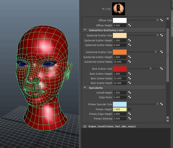 Mayaのスキンシェーダーを適用し、質感の設定をしています。